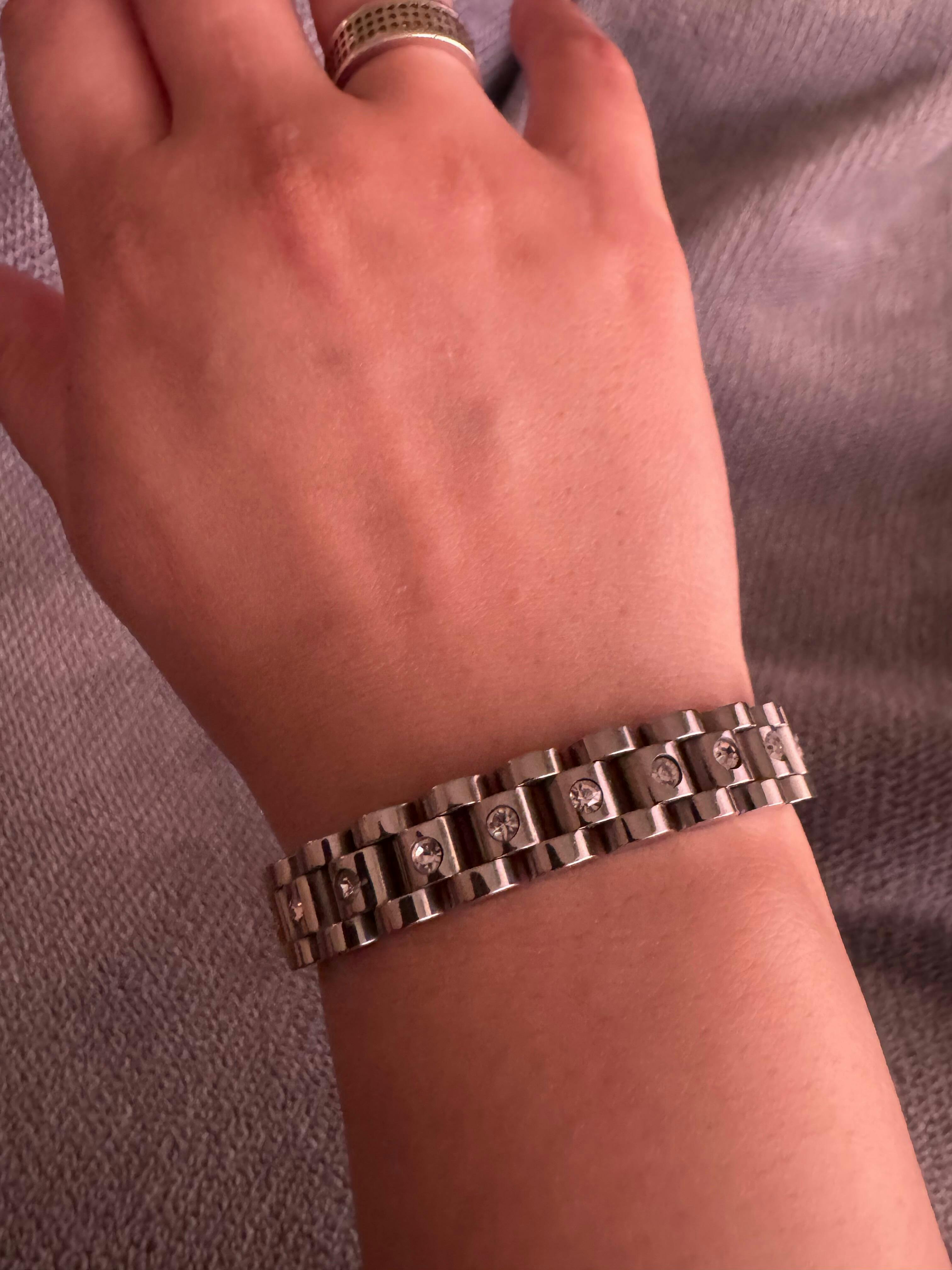 Elevate your look with understated luxury. This stainless steel watch chain bracelet features gleaming round white rhinestones and a polished buckle clasp. Sleek, modern, and subtly bold—perfect for any occasion.